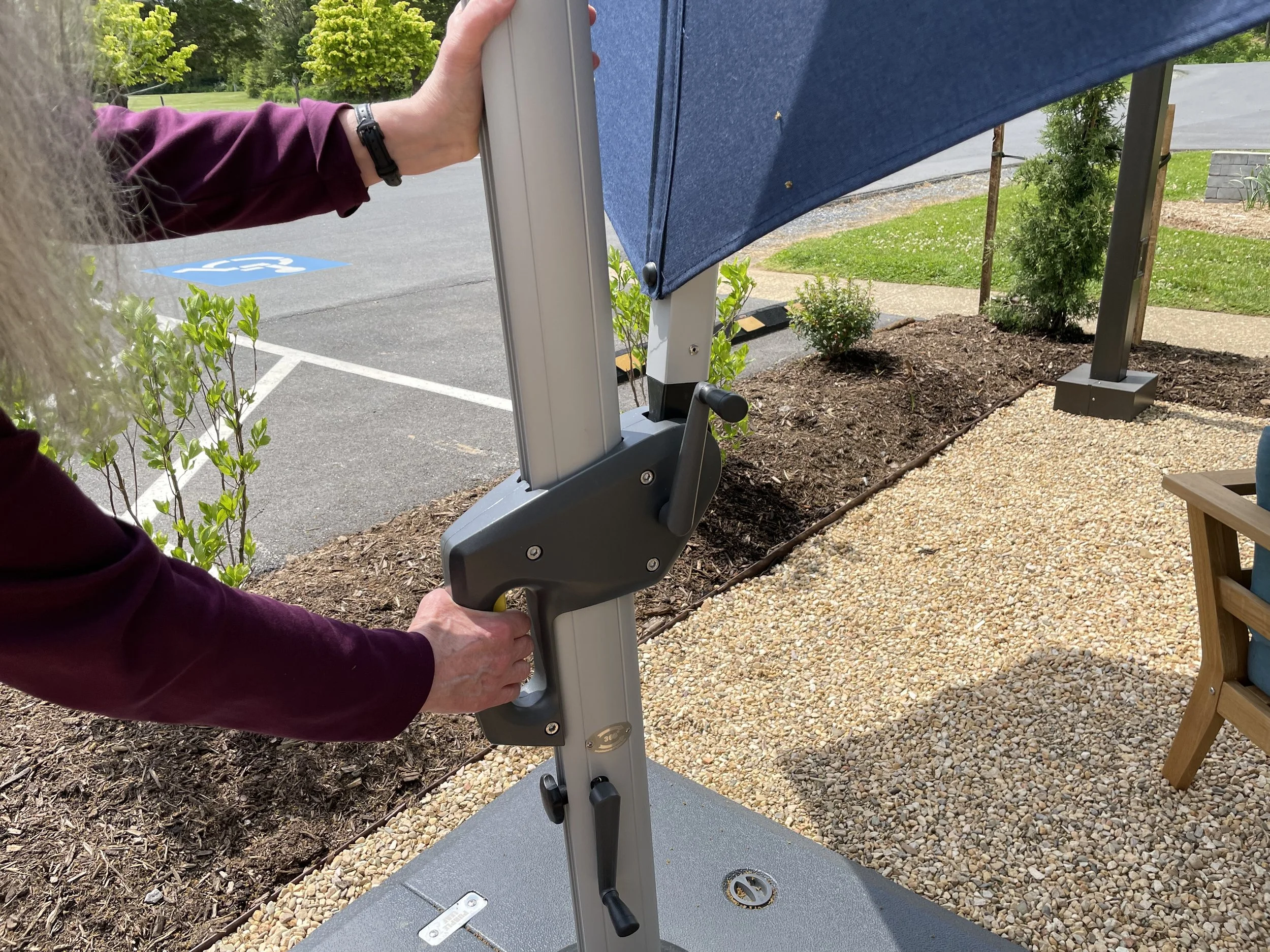 The bottom crank handle swings the umbrella 360 degrees to move where the shade is cast.