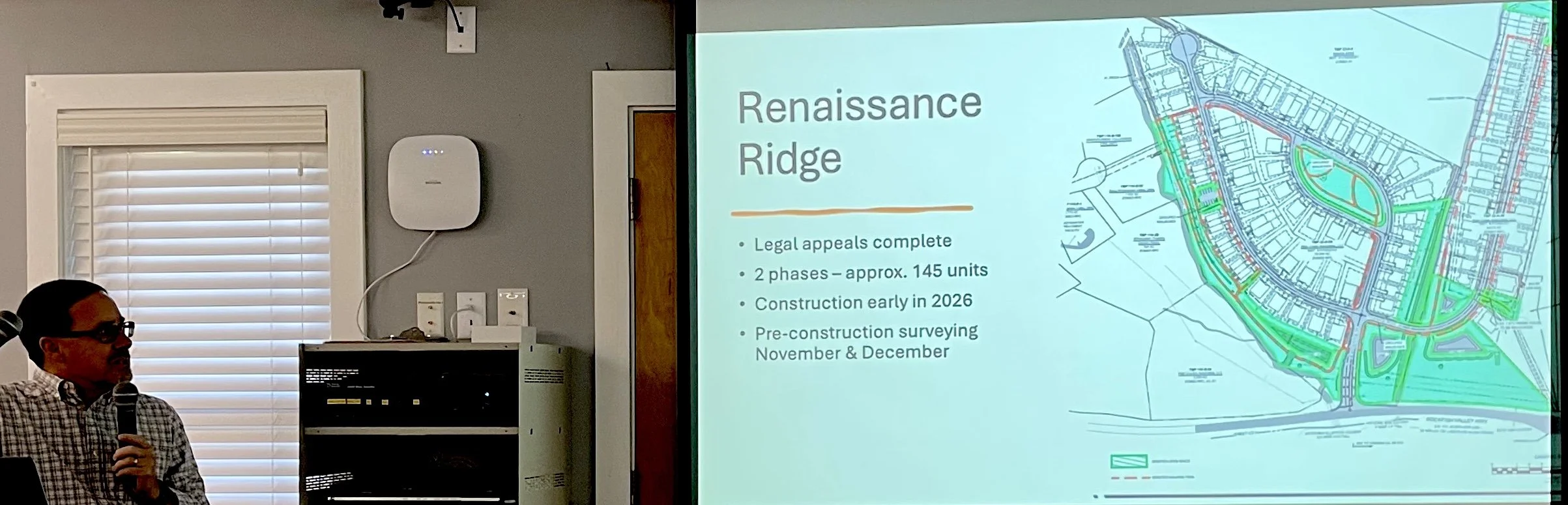 There have been no significant changes in the plans for Renaissance Ridge in the last two years, Jay Roberts said at the Wintergreen Valley Association annual meeting on October 4, 2025, at Tuckahoe Clubhouse.