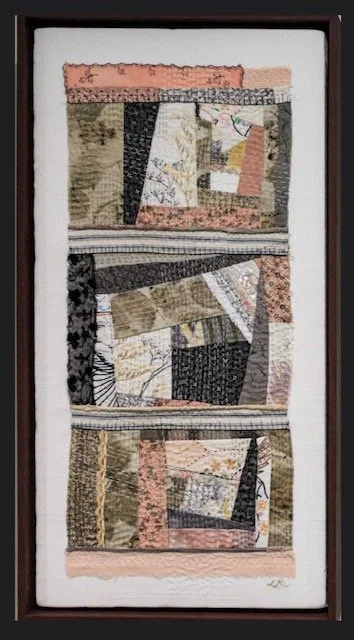 Compositions both abstract and traditional offer compelling textures of hand stitching and needle-felted wool, the softness of pastels, and the ability of botanical “Eco” printed art to intertwine our own journey with nature’s personal imprints. Detail and depth of quality framing helps bring the viewer in to appreciate the intricately detailed creations.