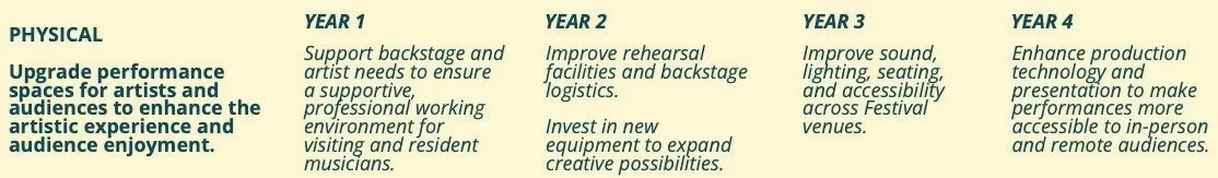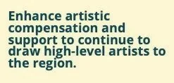 Performers need better facilities and better pay, says the strategic plan. Backstage, rehearsal spaces, sound, lighting, seating and more will be given attention. This year industry compensation standards will be researched with a “small task force involving festival artists.” More opportunities for artists to engage with the community will be offered.