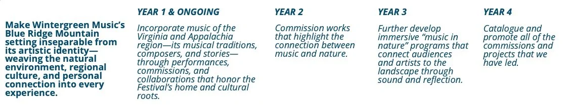 A major artistic goal in the plan is to “deepen Wintergreen Music’s roots within the Blue Ridge Mountains and celebrate the unique beauty of our home at Wintergreen and Nelson County.”
