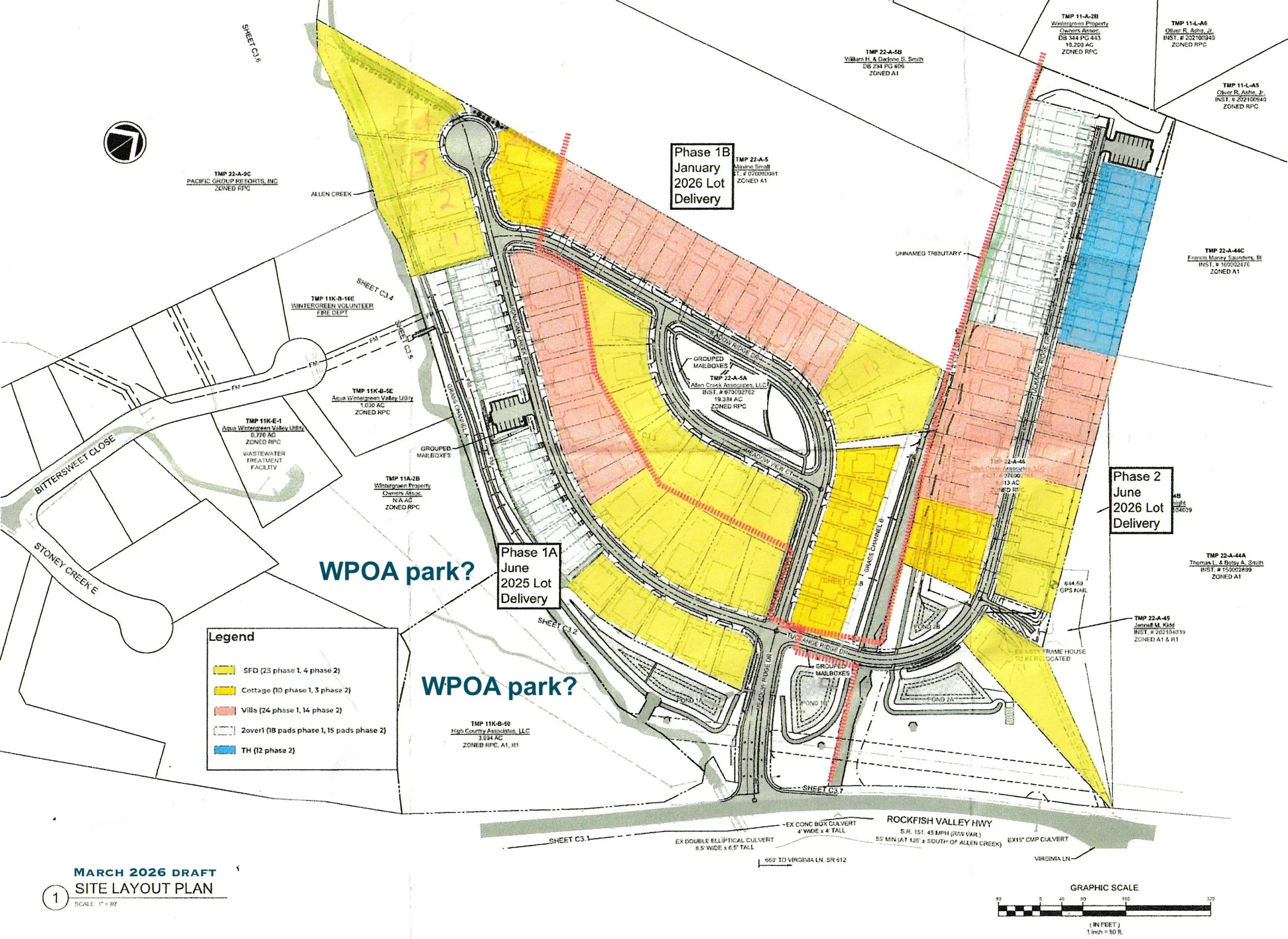 Michael Donovan is offering property adjacent to the entrance of Crawfords Place to WPOA, which is adjacent to property WPOA already owns. These spaces combined could be a new Stoney Creek park with a children’s playground. The new neighborhood will connect to Stoney Creek with walking paths; there will be no road connections other than via Route 151.