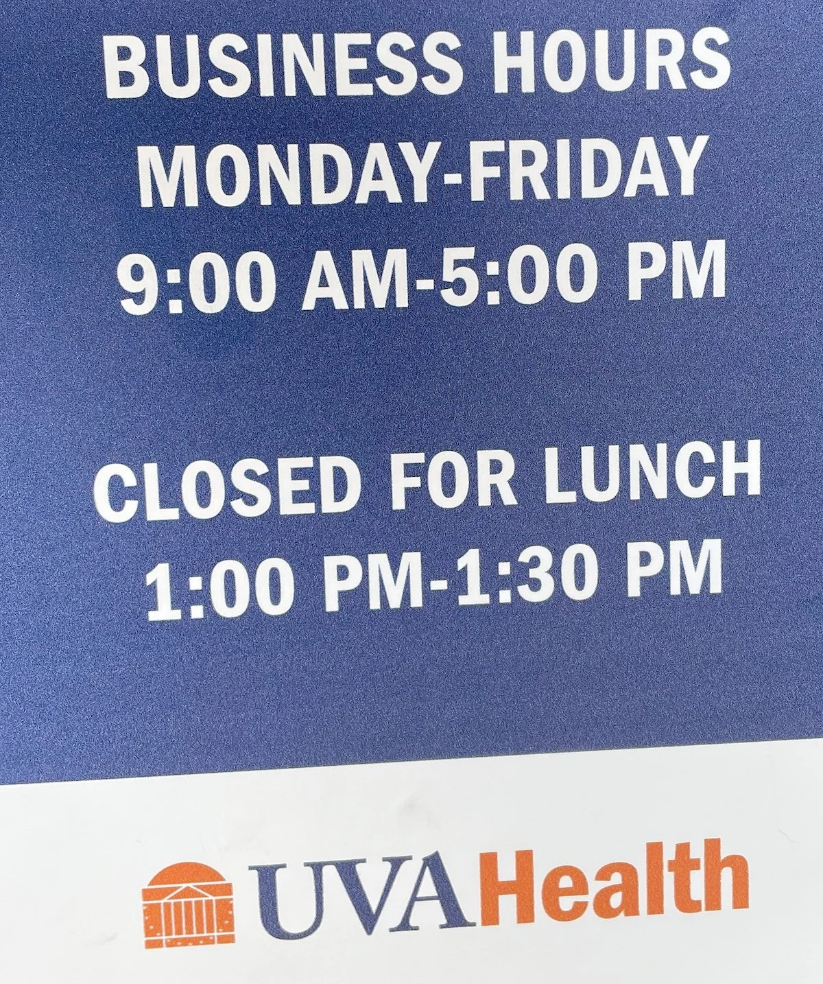 Hours are 9 am to 5 pm, Monday through Friday, closing for a 30-minute lunch break at 1 pm.